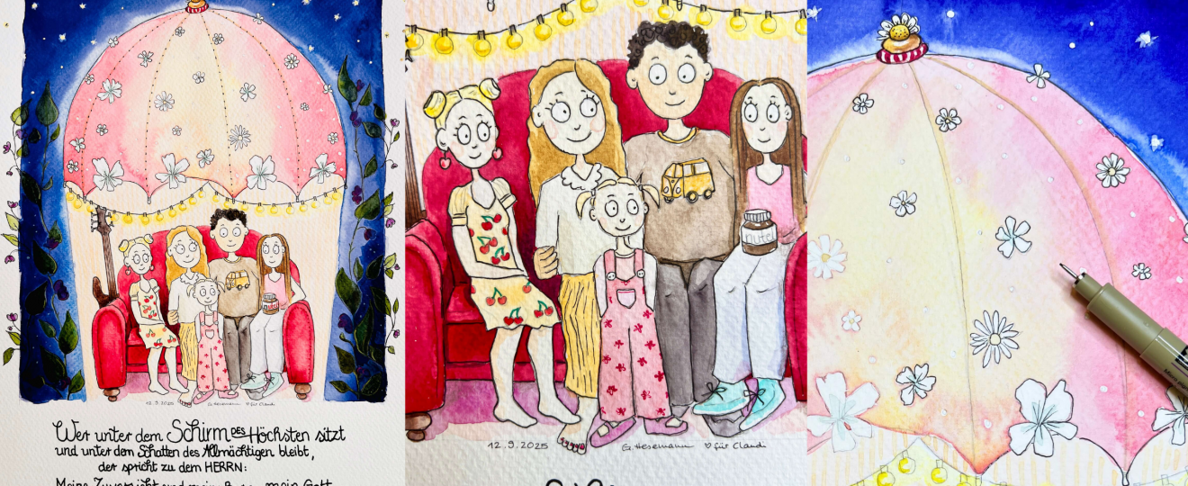 Zuerst war da natürlich der wunderschöne Bibelvers: „Wer unter dem Schirm des Höchsten sitzt und unter dem Schatten des Allmächtigen bleibt, der spricht zu dem HERRN: Meine Zuversicht und meine Burg, mein Gott, auf den ich hoffe!“ aus Psalm 91,1.2. Und ich bekam die Idee, nicht nur meine Freundin Claudia, sondern ihre ganze Familie unter den Schirm zu setzen. Vor meinem inneren Auge sah ich eine Art Lampenschirm, denn Gott ist Licht. Ich startete mit einer Skizze und schnell saß die ganze Familie auf dem Sofa unter dem Schirm.