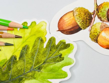 Habt ihr Lust euer Heim herbstlich zu schmücken? Wie wäre es mit einer Girlande aus vielen hübschen, kleinen Aquarellen? Hier präsentiere ich euch meine neuste Herbst-Girlande – mit Eicheln, Kürbis, Fliegenpilz und vielem mehr! Oben seht ihr das Endprodukt: Viele herbstliche Aquarelle hängen mit kleinen Holzklammern an einer Schnur befestigt und dekorieren einen bemalten Ast …